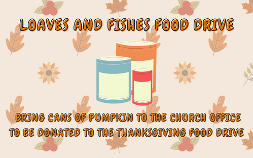 This month, our church is collecting cans of Pumpkin to be donated to the Loaves and Fishes Thanksgiving food drive, so please bring cans of pumpkin to the church office.