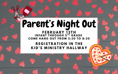 We are hosting another Parents Night out on February 13th from 5:30 to 8:30 for kids infant through 5th grade! Dinner will be provided, and getting registered is easy and free! So get signed up and enjoy a night out.