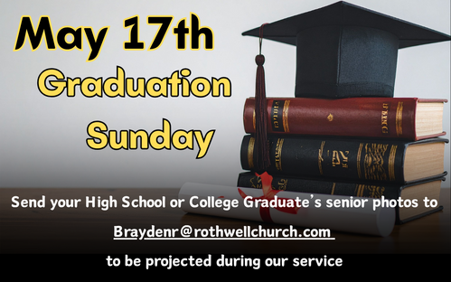Our Graduation Sunday is coming soon! Join us for this special service where we will honor our High School and College graduates and worship with our Youth Ministry Worship Team. If you are a graduate, please send your senior photos to braydenr@rothwellchurch.com, to be projected during our service!