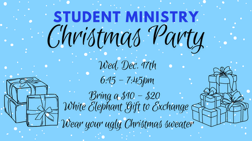 Our Student Ministry Christmas Party is during our usual Wednesday time on December 17th. We have got fun and crazy games and competitions planned, alongside a white elephant gift exchange and ugly christmas sweater competition. See you there students!